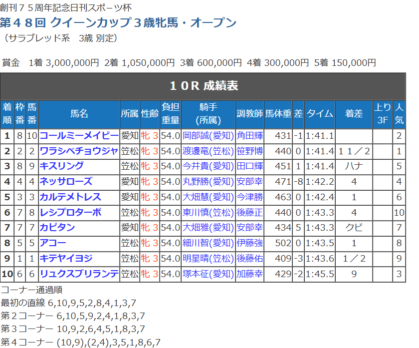 『創刊75周年記念日刊スポ-ツ杯 第48回 クイーンカップ』の結果(笠松競馬) 更新日:2024.06.06 レース情報 NEW 令和6年6月6日(木)に笠松競馬第10競走で行われた「創刊75周年記念日刊スポ-ツ杯 第48回 クイーンカップ3歳牝馬(SPⅢ)」は、岡部誠騎手騎乗の「コールミーメイビー号」【角田輝也厩舎】が優勝しました。 前のページに戻る